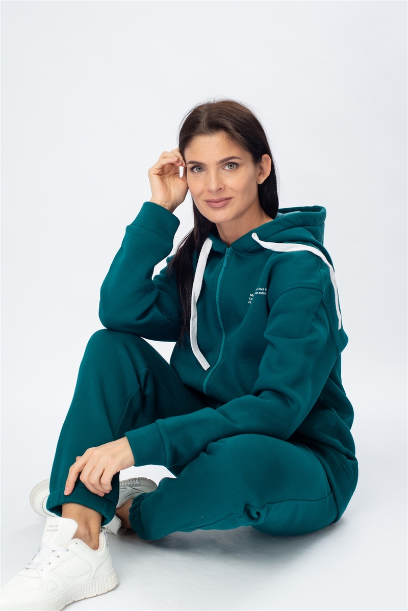 Теплый, удобный в носке женский костюм, состоящий из мастерки свободного кроя на молнии, с накладными карманами и капюшоном, а также, штанов на резинке, отлично подойдет для прогулок в прохладную погоду, пикников, любых активных занятий. Для пошива используется натуральный хлопок – экологически безопасный материал, не вызывающий раздражения и не способный спровоцировать аллергическую реакцию. Ткань воздухопроницаема, поэтому даже при жаре в таком комплекте будет вполне комфортно. Широкий размерный ряд с 48 по 58 позволяет каждой женщине, независимо от комплекции, приобрести эту модель.