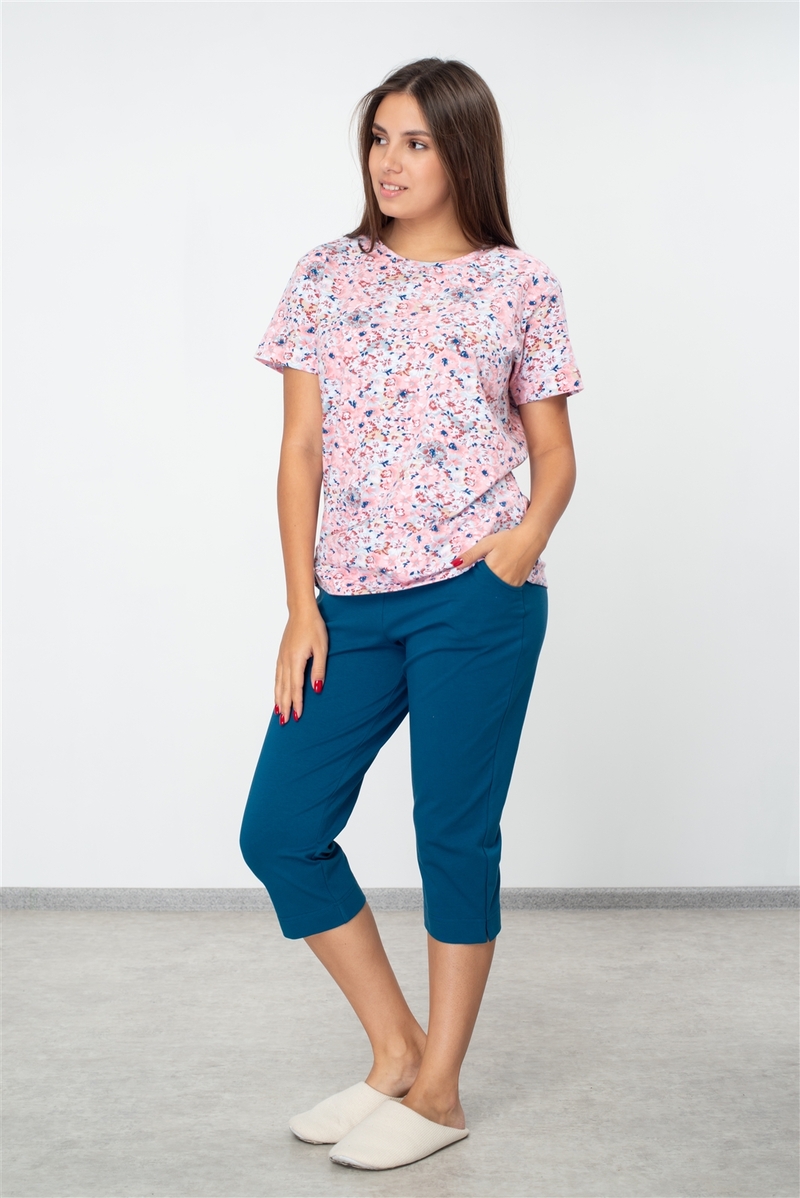 Очаровательная, комфортная в носке пижама состоит из футболки с короткими рукавами и бридж длиной ниже колен. Она отлично подходит для сна и ношения в вечернее время. Изготовлена из хлопка (95%) и эластана (5%), материала приятного на ощупь, мягкого. Ткань легко переносит многократную стирку, не теряя форму и цвет. Модель представлена в разных цветовых вариациях, привлекающих внимание нежностью оттенков. Широкий размерный ряд – с 46 по 58 позволяет женщинам любой комплекции приобрести эту уютную домашнюю вещь.