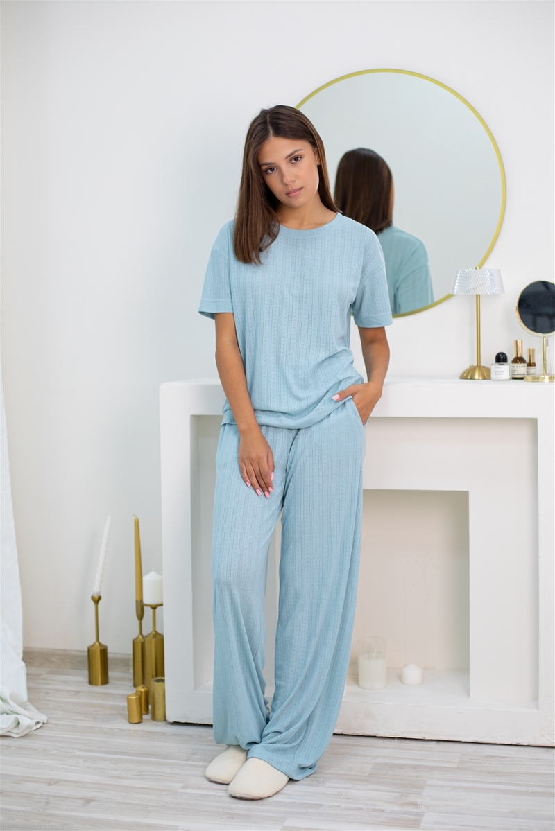 Комплект состоит из свободной футболки и эластичных брюк, которые дарят ощущение невесомости и абсолютного расслабления. Пастельная гамма в мятных и серых оттенках создаёт атмосферу безмятежности, а продуманный крой подчеркивает естественную женственность силуэта. Модель представлена в большой размерной сетке от 46 до 56 размера.