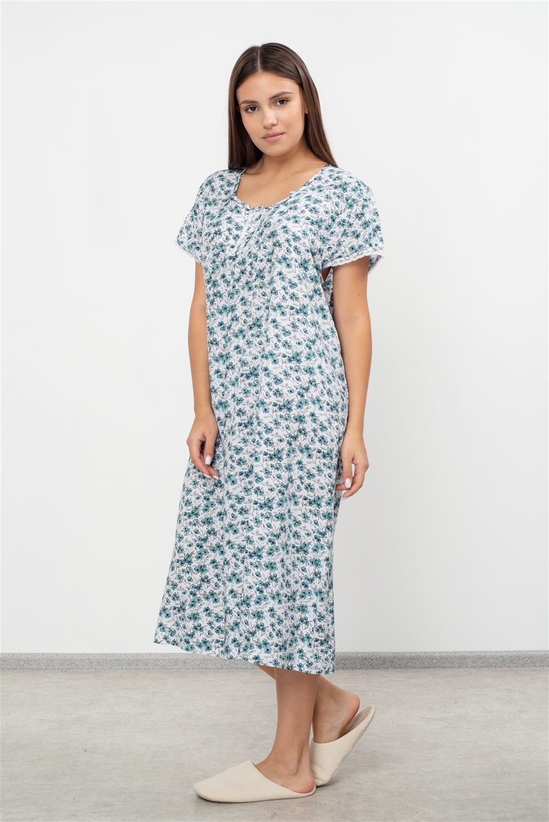 Модель представлена в классическом белом цвете, украшенном изящным цветочным рисунком глубокого зелёного оттенка. Свободный крой, длина ниже колена и короткий рукав создают расслабленный, струящийся силуэт, в котором так приятно засыпать и просыпаться. Сорочка отшивается от 46 до 62 размера.