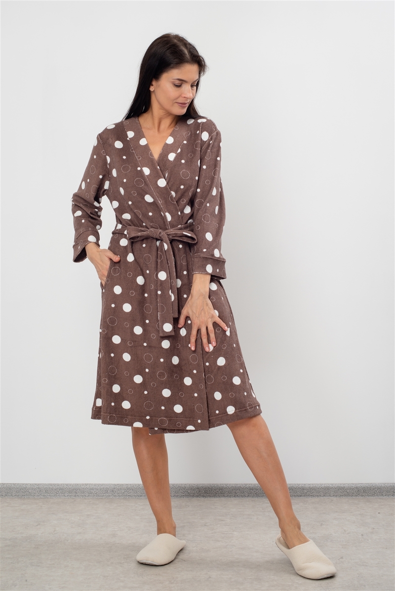 Халат «Венеция» из нежной махры — это идеальный спутник домашнего уюта. Мягкая ткань с составом 95% хлопка и 5% эластана дарит телу дышащую нежность и лёгкое облегание, сохраняя свою форму. Густая и пушистая махра создаёт ощущение тепла и комфорта, в котором приятно отдыхать в любое время. Широкая размерная линейка от 46 до 58 позволяет подобрать идеальный вариант для любой фигуры, гарантируя свободу движений и комфортную посадку. Удобный запах, длина ниже колена и классический рукав делают эту модель практичной и универсальной. Халат представлен в коричневом цвете с игривым принтом в виде белого горошка, создавая непринуждённое и радостное настроение.