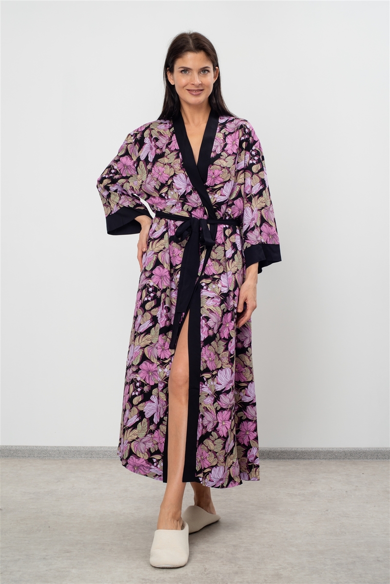 Роскошный женский халат в стиле «Кимоно» станет воплощением уюта и элегантности в вашем гардеробе. Модель выполнена из струящейся и приятной к телу вискозы, которая мягко обволакивает, даря невероятное ощущение комфорта. Ткань - набивной штапель с выразительным цветочным принтом в фиолетовых тонах на глубоком черном фоне.